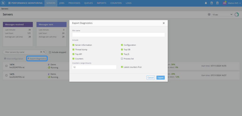 Added the ability to export diagnostics in Performance monitoring