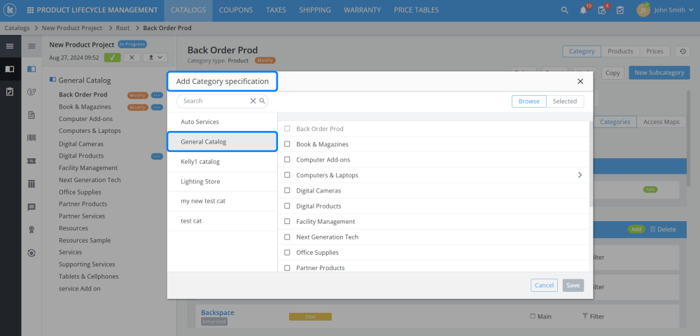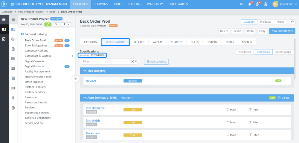 Previously, adding category specifications was limited to doing so within the same catalog, specifications can now be included from other catalog categories. Additionally, users can now view the specification version.