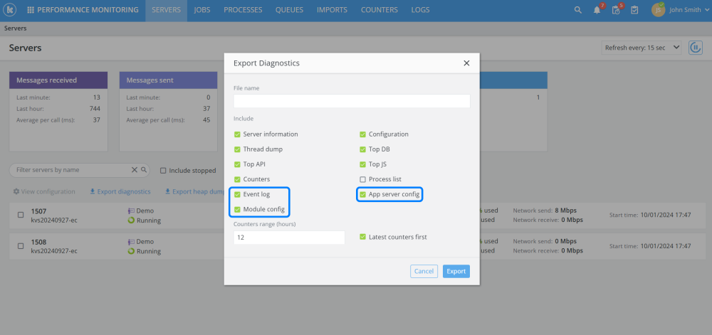Enhanced APM application to optionally export event logs and app server configuration data when exporting diagnostic information.