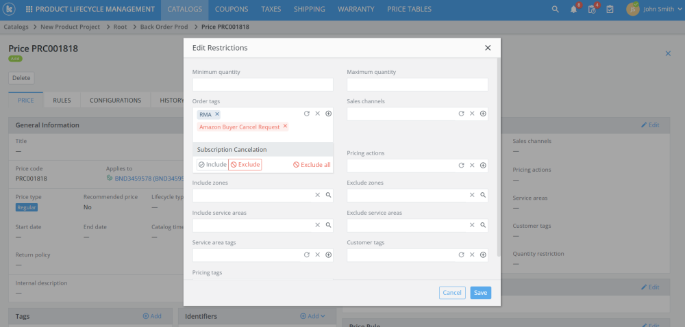 Within catalog rules and prices, sales teams have been added as a restriction. Users can now create a rule that will include or exclude certain sales teams.
