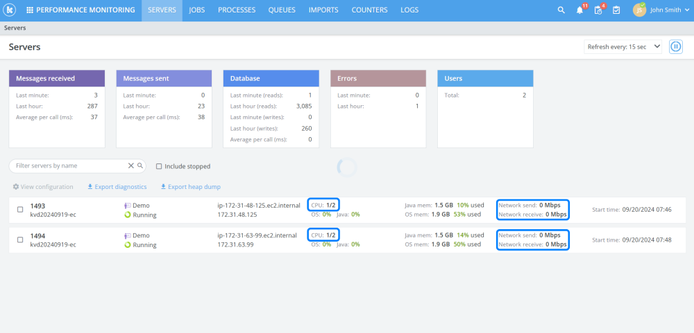 Enhanced the server monitoring page to include: The number of threads, cores the CPU has and the current network utilization information for each server.