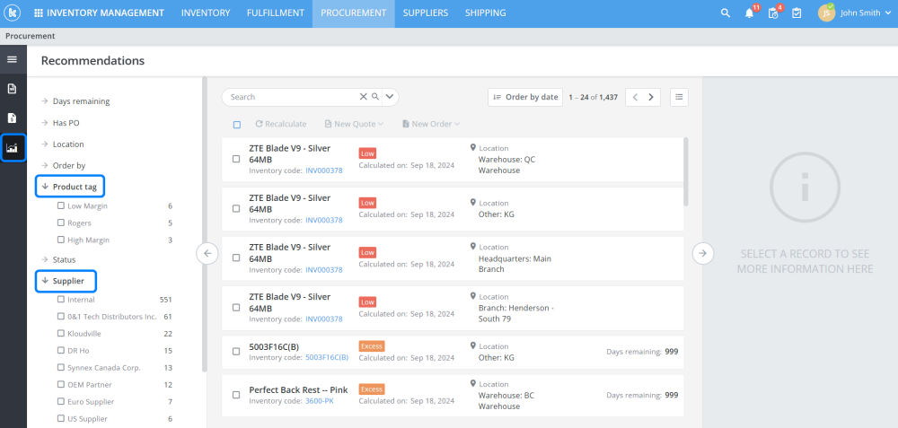 In the Inventory application, the “Recommendations” page has been enhanced to filter search results by suppliers and product tags.