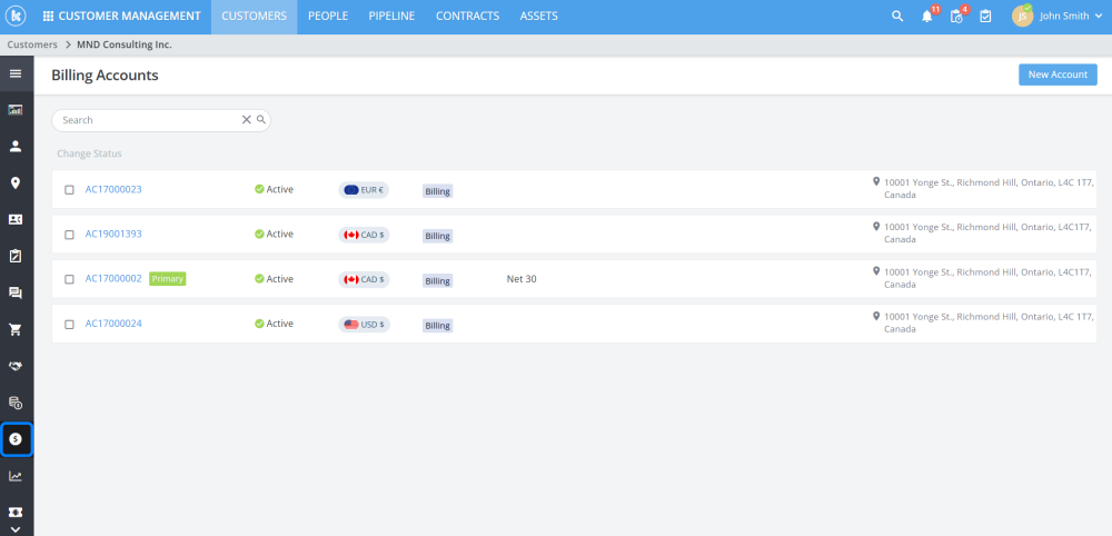 Customer and partner billing accounts have been reorganized to show all the accounts as a search page list. Simplifying the process of navigating through accounts.