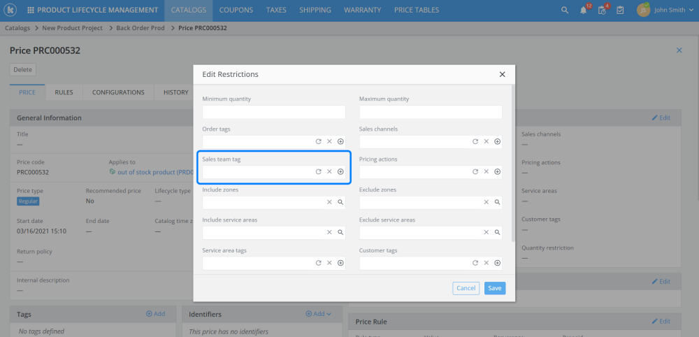 Added sales teams restrictions to catalog rules and pricing rules