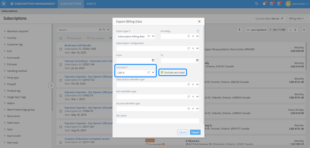 When exporting billing data in subscriptions, users can now filter by currencies and exclude any subscriptions with a value of zero.