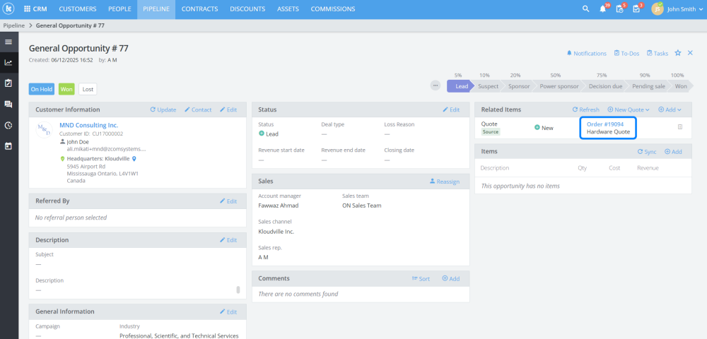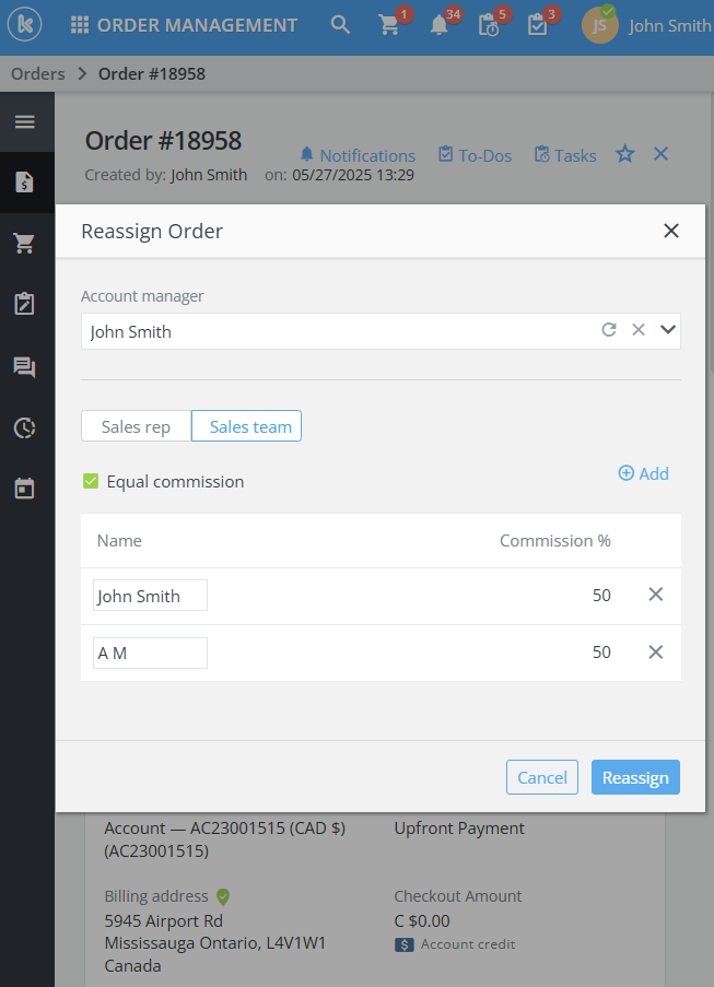 Multiple sales reps can now be assigned to the same opportunity, quote or order. Additionally, the commission share for each sales rep can be specified by percentage.