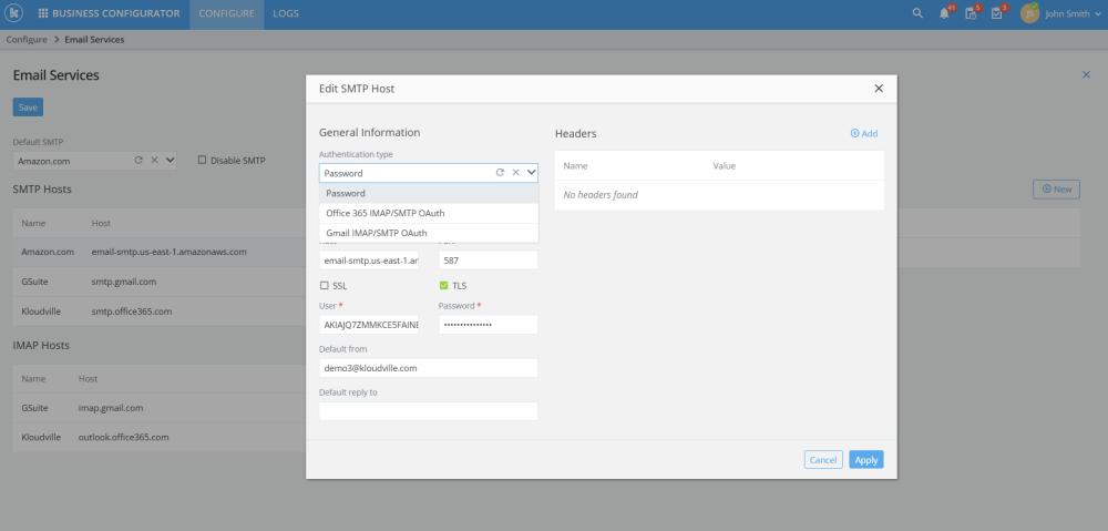 Enhanced email configuration by adding support for OAuth 2 authentication, default reply to emails and custom headers