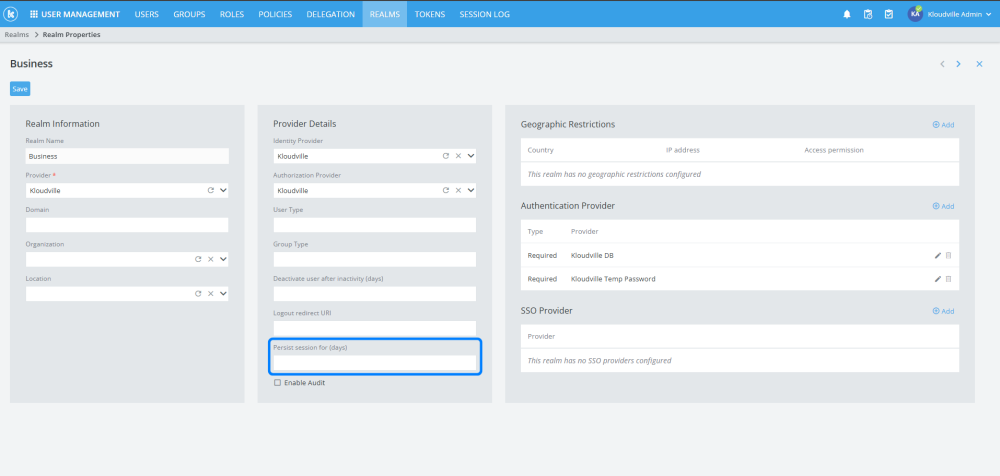 Realms in Kloudville can now be configured to persist a user’s login session for a set number of days.
