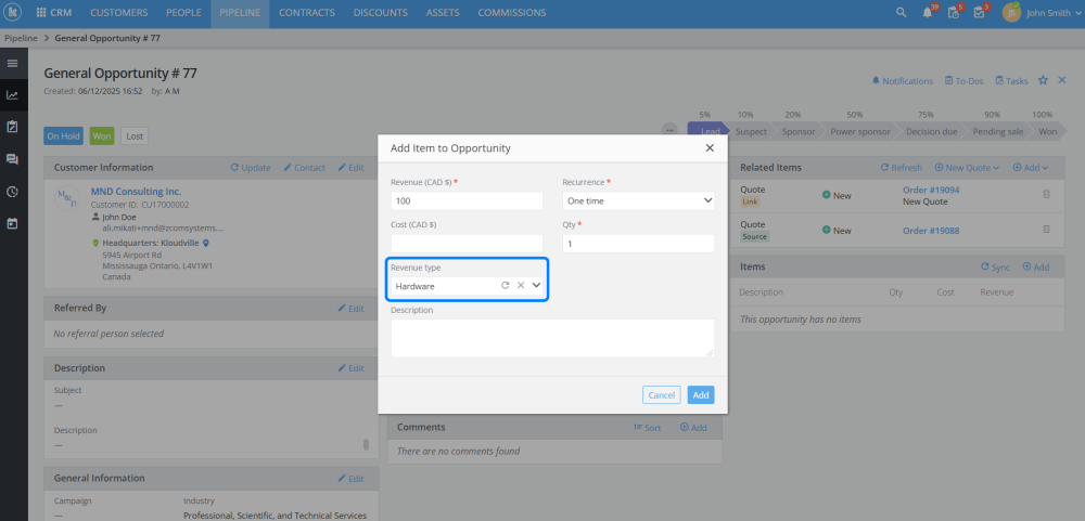 When adding an item to an opportunity, users can now classify revenue items.