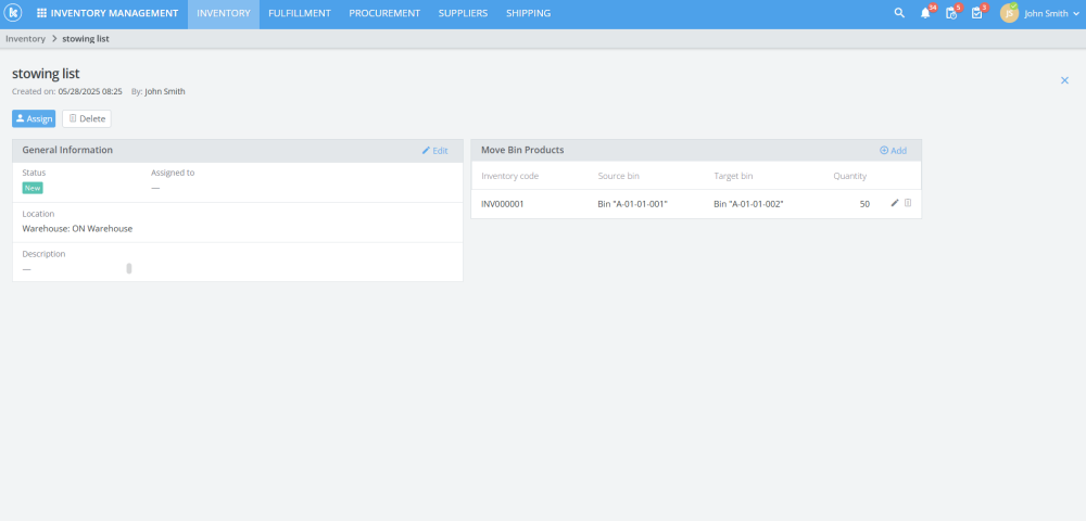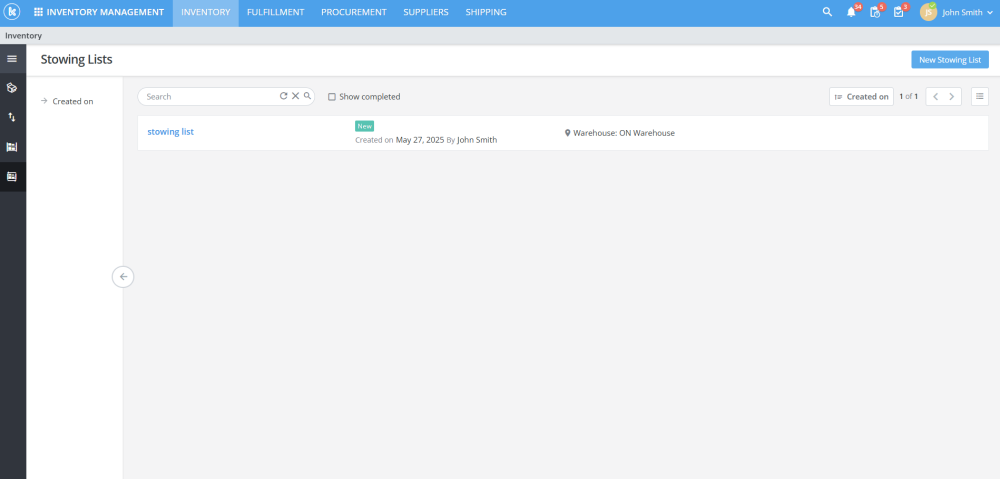 In Inventory, users can now create stowing lists and assign them to pickers/stowers. Stowing lists record product movements from one bin to another.