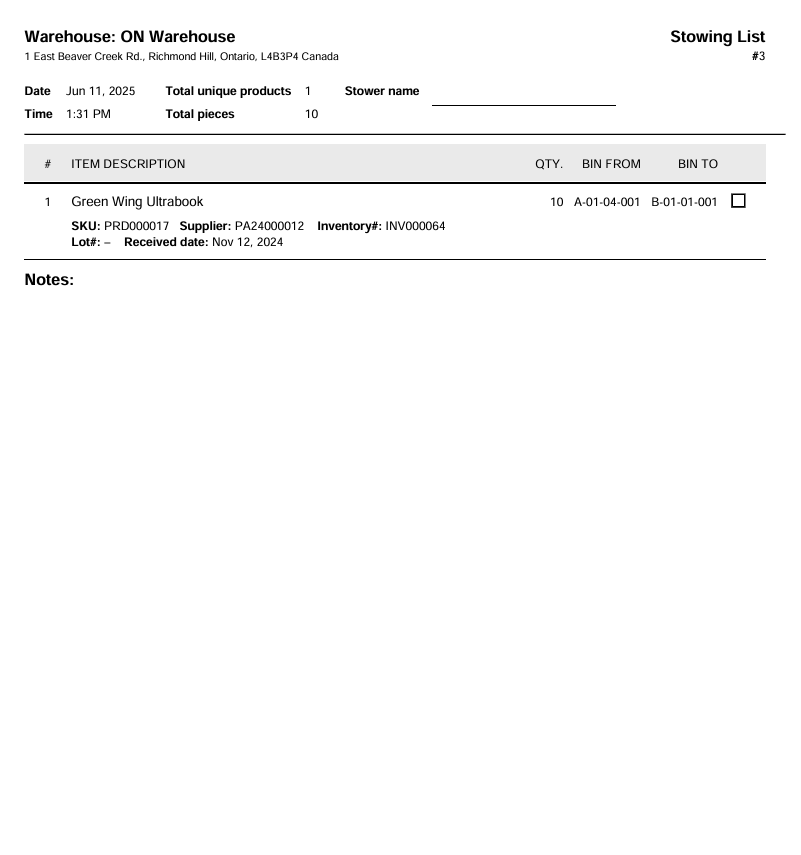When a stowing list is marked as completed, the bin’s records are updated to reflect these moves.
