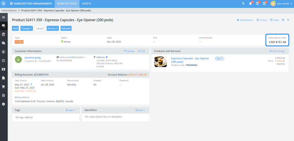The total price of a subscription, including the prices of all products, addons and devices, will now be shown in Subscription total. This price is what the customer pays per-recurrence.