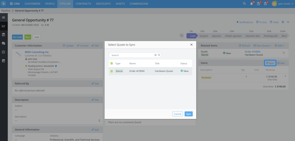 By syncing a quote to an opportunity, any updates to the quote’s values will be reflected in the opportunity.