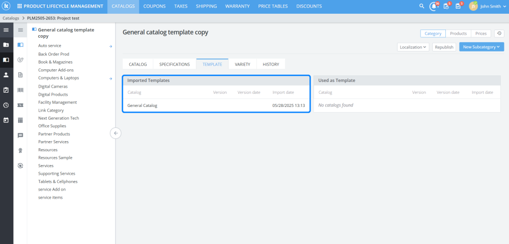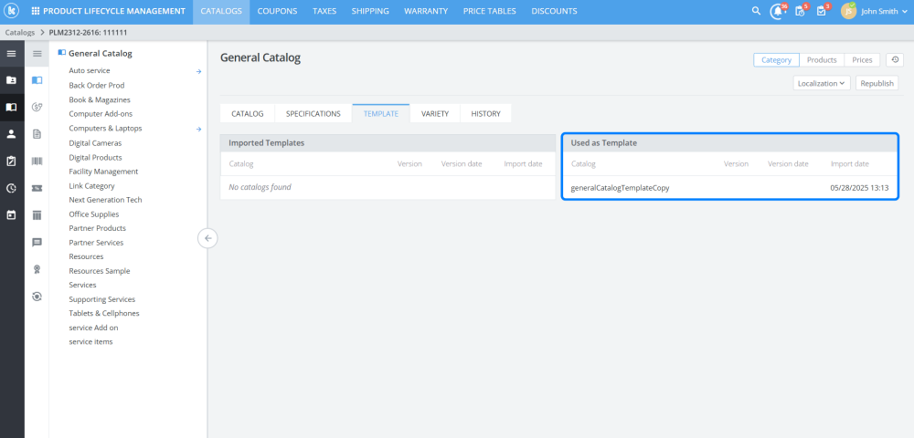 In a PLM category, the specifications tab will now list the category’s versions, dates, template names and catalog names.